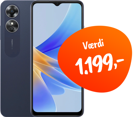 Dette tilbud gælder for privatkunder og gælder så længe lager haves. Ved fortrydelse skal OPPO A17 returneres i original emballage. Abonnement og OPPO A17 er et samlet køb og kan ikke ombyttes til kontanter. Da der er tilknyttet hardware til dette abonnement, forbeholder vi os retten til at afvise købet, hvis du er registreret i RKI. Det er muligt at købe ét abonnement med OPPO A17 pr. CPR-nummer. Alle priser er inkl. moms.