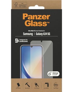 Skærmbeskyttelse fra PanzerGlass beskytter Samsung Galaxy A34 mod alle slags uheld. Når først skærmbeskyttelsen er monteret skal du ikke frygte for ridser, buler eller flænger.