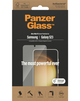 Skærmbeskyttelse fra PanzerGlass beskytter Samsung Galaxy S23 mod alle slags uheld. Når først skærmbeskyttelsen er monteret skal du ikke frygte for ridser, buler eller flænger.