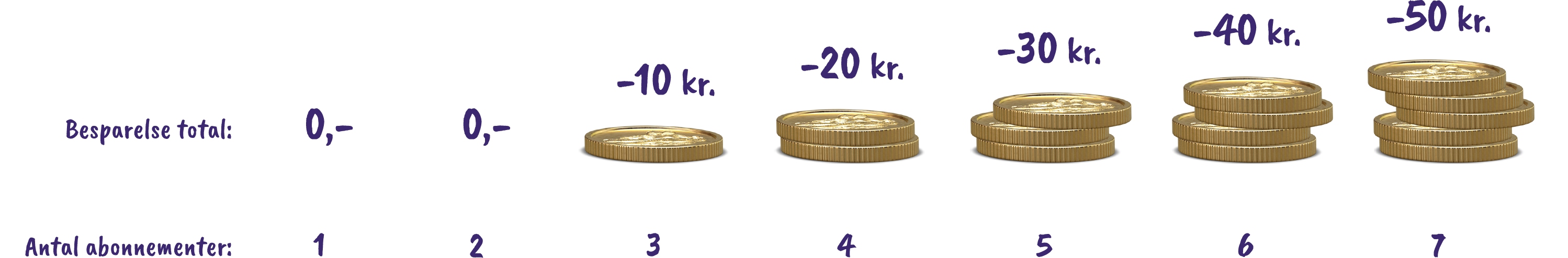 Hos OiSTER opnår du helt automatisk mængderabat, når du har mindst 3 aktive abonnementer på din OiSTER-konto. Rabatten er på 10,-/md. og stiger jo flere abonnementer, du har. Der er altså penge at spare, når du samler familiens abonnementer under ét tag hos OiSTER.