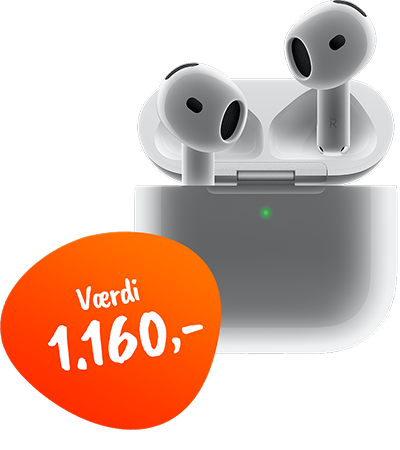 Dette tilbud gælder for privatkunder og gælder så længe lager haves. Ved fortrydelse skal AirPods returneres i original emballage. Abonnement og AirPods er et samlet køb og kan ikke ombyttes til kontanter. Da der er tilknyttet hardware til dette abonnement, forbeholder vi os retten til at afvise købet, hvis du er registreret i RKI. Det er muligt at købe ét abonnement med AirPods pr. CPR-nummer. Alle priser er inkl. moms.