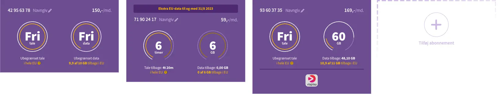 De hvide og gule cirkler på dit abonnementskort viser dig, hvor meget tale og data du har tilbage i den pågældende måned. Den hvide cirkel viser tale og data i Danmark, mens den gule viser tale og data i EU. Når du bruger af din tale og data, vil den hvide og gule farve forsvinde fra cirklerne. Det vil sige, at det hvide og gule er det, du har tilbage, og det, du har brugt er den mindre tydelige del af cirklen. Under cirklerne kan du altid se, hvor meget tale og data, du har tilbage.