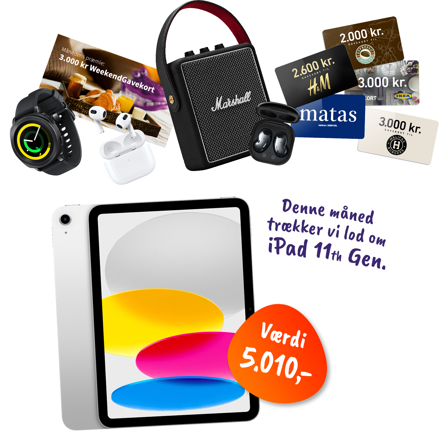 I december trækker vi lod om en iPad 11th gen 128 GB til en værdi á 5.010,-. Præmien kan ikke byttes til kontanter, og vinderen får direkte besked den sidste hverdag i måneden via mail.